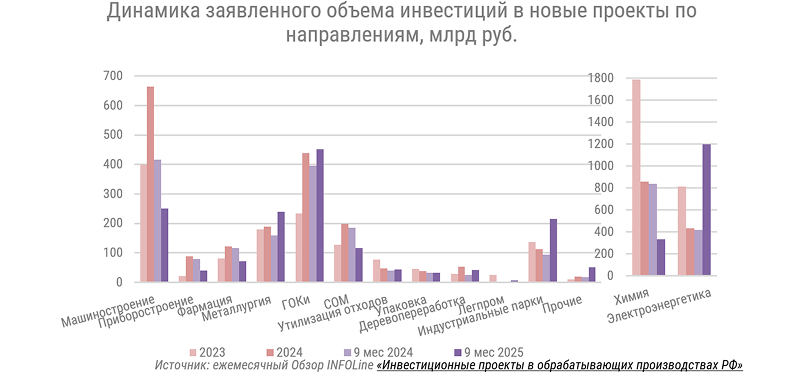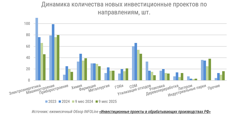 «Наибольшее число новых проектов строительства и реконструкции промышленных предприятий за 9 месяцев 2025 года в отрасли машиностроения, электроэнергетике и на рынке строительно-отделочных материалов и товаров DIY. При этом динамика заявленного объема инвестиций в новые проекты в электроэнергетике увеличилась в три раза по сравнению с аналогичным периодом прошлого года. Причиной послужил старт новых крупных инвестиционных проектов в отрасли», - указали в INFOLine.