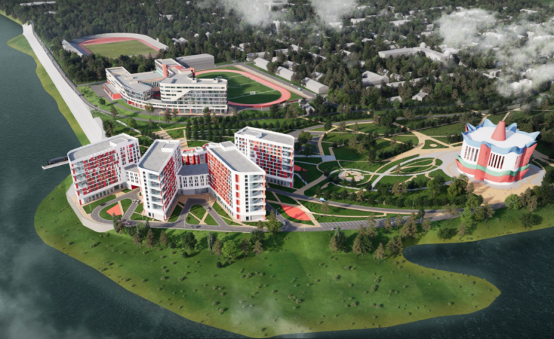 Все здания будут разной этажности. Студенческое общежитие не будет превышать 11 этажей, а учебный корпус - 7, общежитие для преподавателей будет 1-4-этажным.