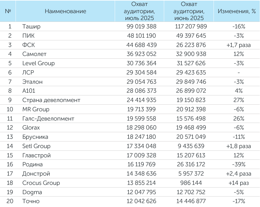 Система мониторинга и анализа СМИ и соцмедиа СКАН-Интерфакс совместно с онлайн-порталом «Строительная газета» подготовили медиарейтинг девелоперских компаний за июль 2025 года. В рейтингах девелоперов в июле 2025 года сохранили свое присутствие ГК «Ташир», ГК ПИК, ГК «Самолет» и ГК ФСК.