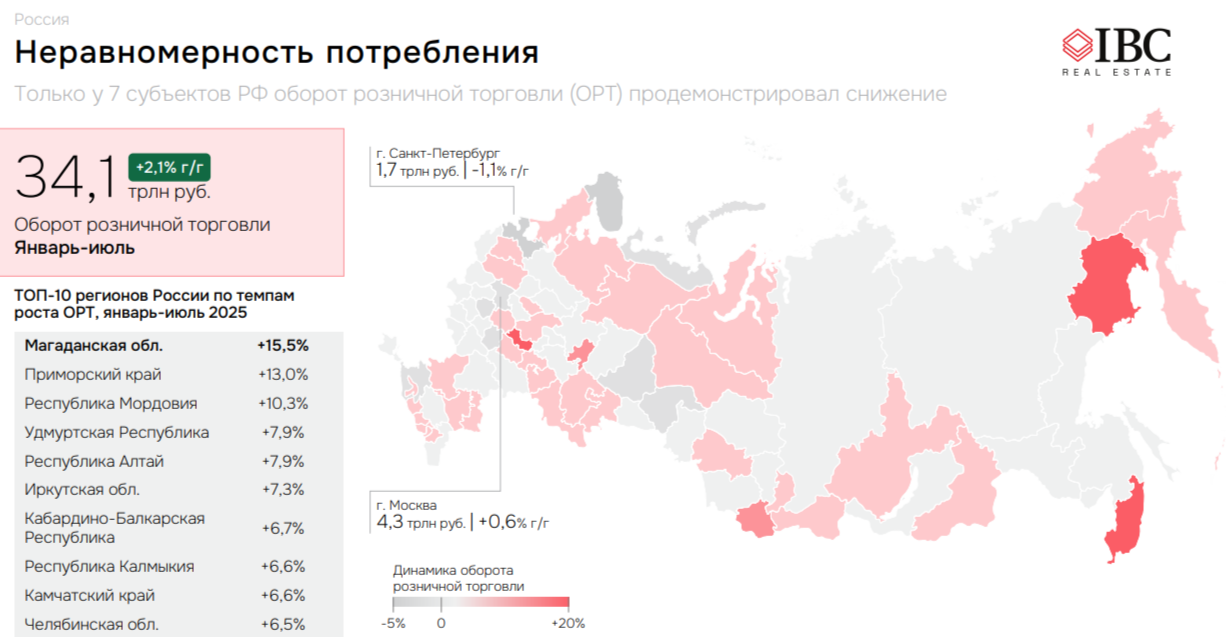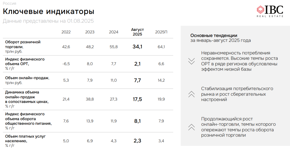 «Население продолжает тратить, однако динамика роста демонстрирует снижение. Среди тенденций, которые мы увидим до конца 2025 года, будет сохранение сдержанных темпов потребительского рынка», - указала руководитель департамента исследований и аналитики IBC Real Estate Екатерина Ногай.