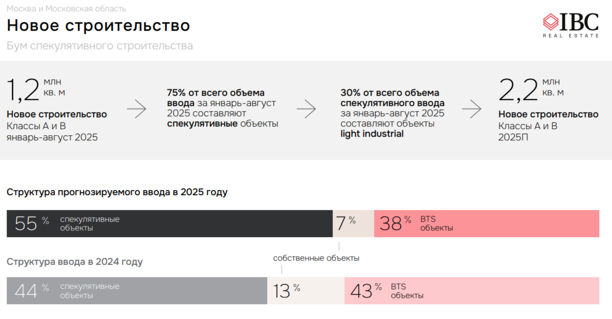 Руководитель департамента по работе со складскими помещениями IBC Real Estate Евгений Бумагин отметил, что объем нового складского строительства в Московском регионе увеличился в два раза по сравнению с аналогичным периодом (янв.–авг.) прошлого года.