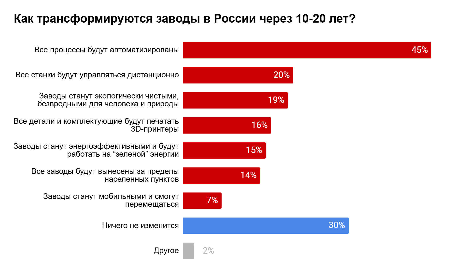 Кроме того, 20% считают, что на заводах будущего будет использоваться исключительно дистанционное управление всеми станками, 16% добавили, что детали и комплектующие для разных целей будут печатать 3D-принтеры, а 7% предположили, что производственные площадки станут мобильными и смогут перемещаться.