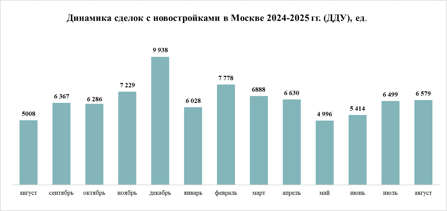 В августе 2025 года, согласно данным Росреестра Москвы, на рынке строящегося жилья зафиксирован резкий рост активности в годовом выражении. Всего за месяц было зарегистрировано почти 6,6 тыс. договоров долевого участия (ДДУ), что на 31% больше, чем в августе 2024 года, когда было зафиксировано 5,0 тыс. ДДУ. Относительно июля 2025 года (6,5 тыс. ДДУ) спрос практически не изменился (рост всего на 1%). Столь впечатляющая годовая динамика во многом объясняется эффектом низкой базы, так как август 2024 года был крайне слабым месяцем для рынка.