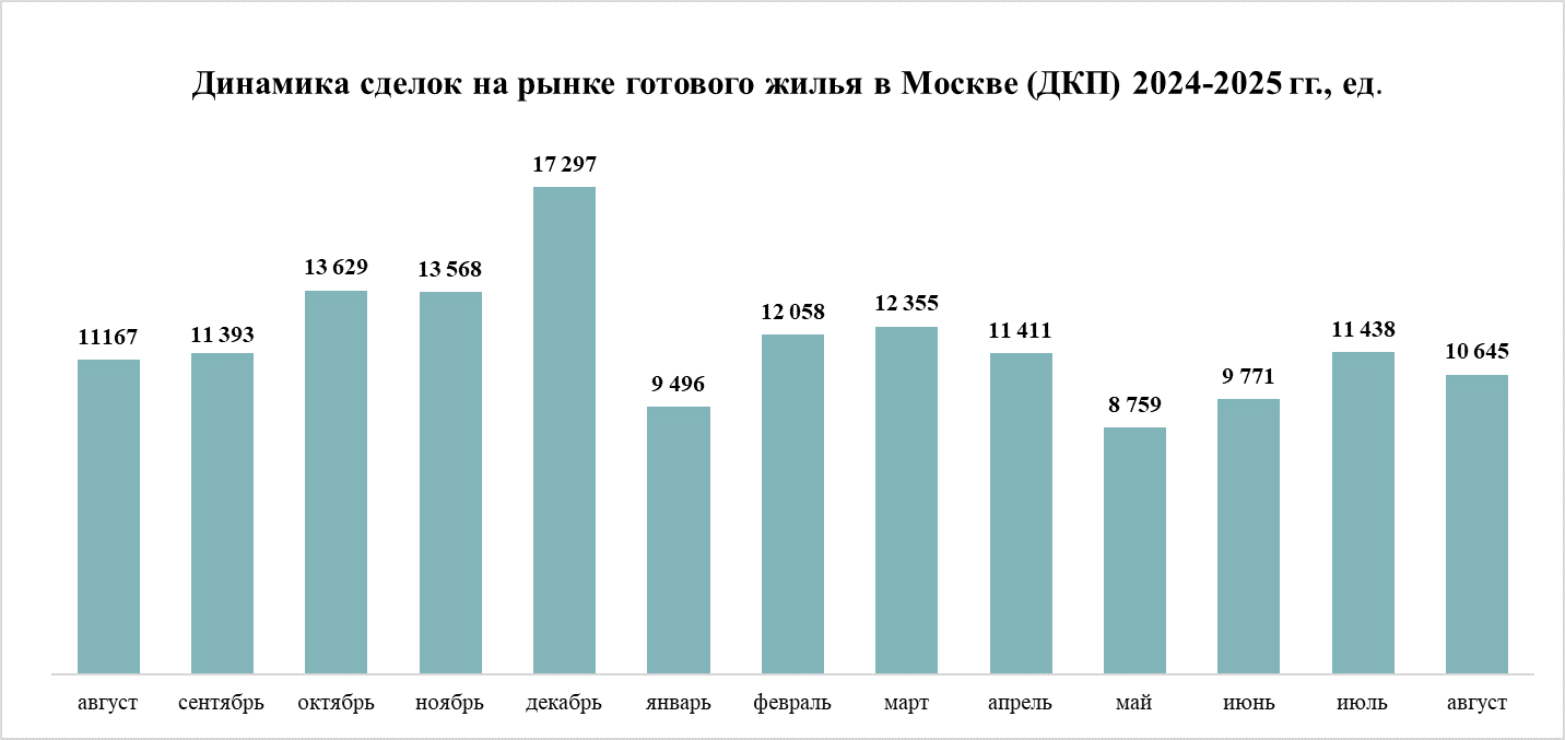 На рынке готового жилья (введенные в эксплуатацию новостройки и вторичное жилье) в августе 2025 года спрос немного сократился. Было зарегистрировано 10,6 тыс. договоров купли-продажи, что на 5% меньше, чем в августе 2024 года, когда было зафиксировано 11,2 тыс. сделок. Относительно июля 2025 года, когда Росреестр Москвы зарегистрировал 11,4 тыс. соглашений, спрос уменьшился на 7%. Это снижение укладывается в рамки сезонного фактора, связанного с периодом летних отпусков. В целом годовые показатели подтверждают, что рынок готового жилья, как и другие сегменты, находится в фазе стабилизации.