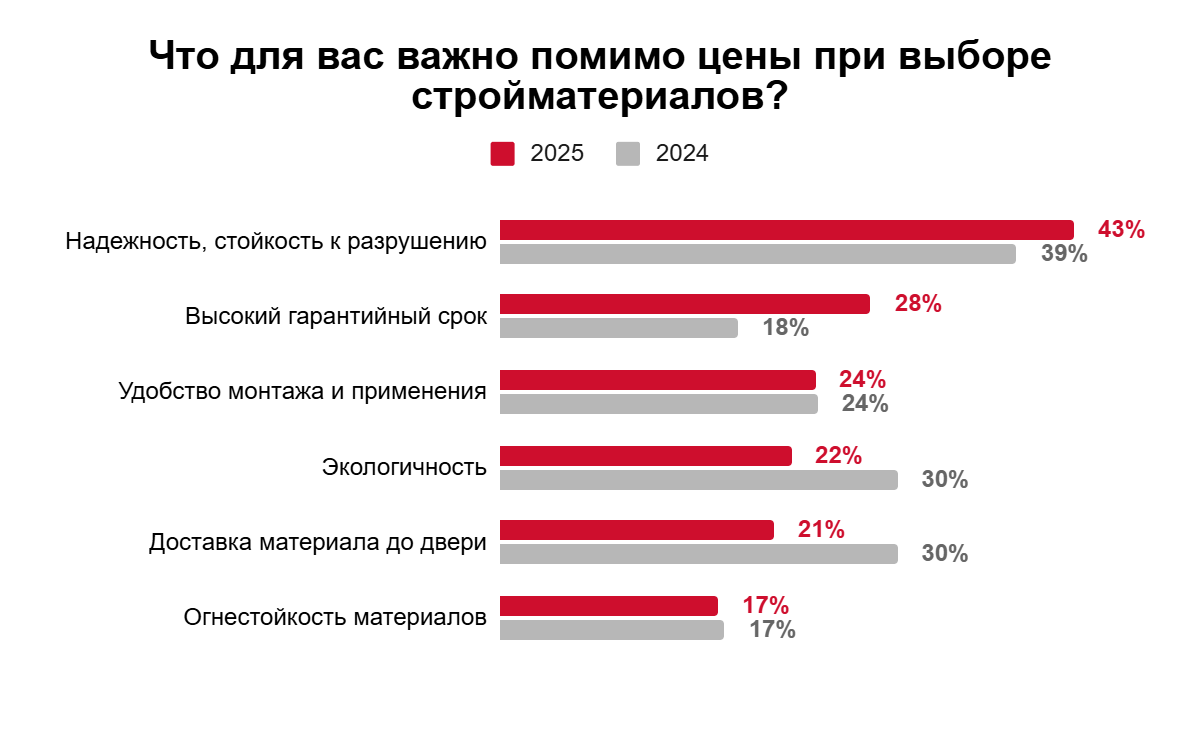 Среди других критериев выбора стройматериалов: экологичность (22% против 30% годом ранее), доставка «до двери» (21% против 30%), огнестойкость (17%, без изменений). Так, растет значимость надежности и гарантий, а доставка и экологичность теряют часть позиций. В условиях ограниченного бюджета покупатели чаще ориентируются на практичность и длительный срок службы, даже если приходится жертвовать удобством.
