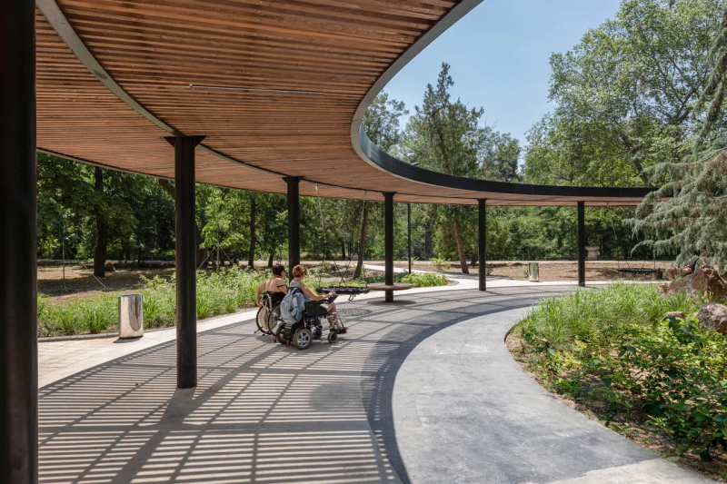 Работа в Саки показала, что инклюзивная среда — это не просто пандусы и широкие двери, а сложное комплексное проектирование, учитывающее реальные сценарии использования. Так в парке предусмотрены площадки для тихого семейного отдыха, зоны спортивных активностей, включая дорожки для игры в популярный у отдыхающих петанк, а также детская площадка с возможностью совместной игры для детей на колясках и без них.